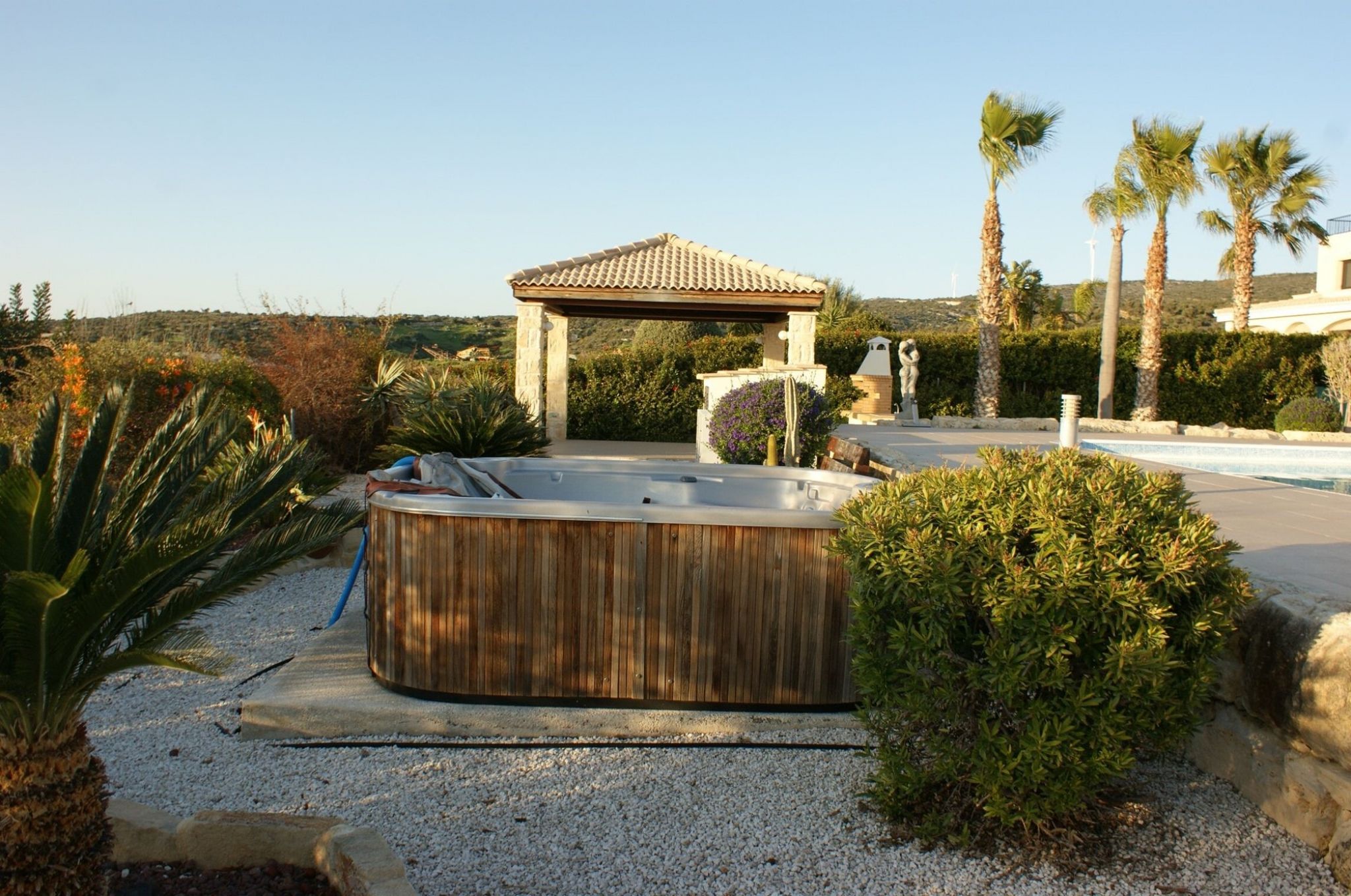 Situated on 3 levels with the Open plan Kitchen/dining area & large lounge area on the main level all with access out the the Large Swimming Pool with sunbathing & shaded areas also a fantastic mature garden & also a Hot tub at the bottom of the garden, there is a huge outside space at the rear of this Villa all totally private..