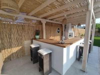 Next to the house there is a swimming pool with a bar counter, a barbecue area, and a place for sunbathing.