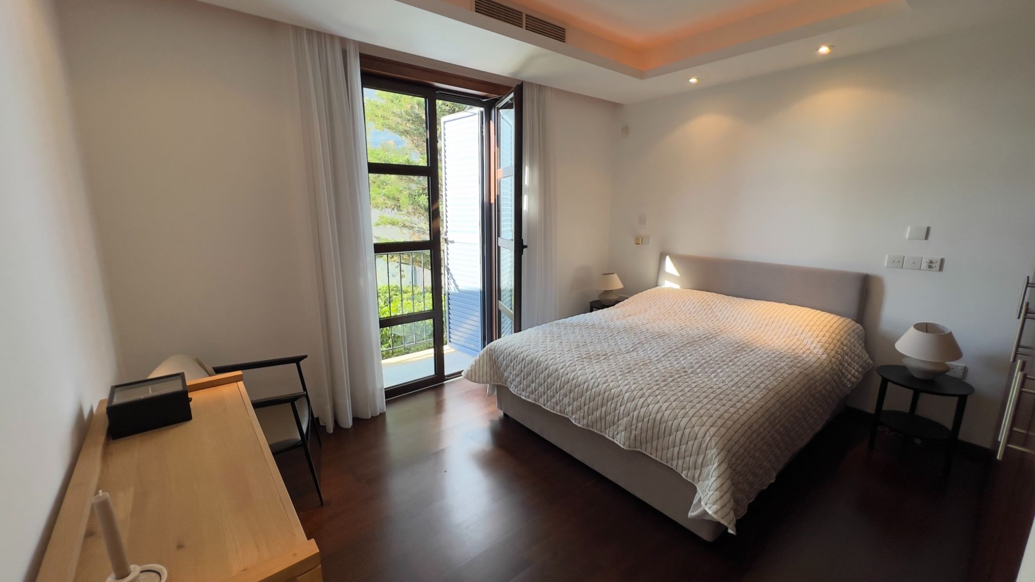 The property is fully furnished and equipped with electrical appliances and has 2 bathrooms (1 ensuite with the bathtub and the shower and a second bathroom with just the shower), 2 spacious bedrooms with built-in wardrobes, a living room and dining areas, a separate kitchen, and windows (manual) shutters. Water pressure system and VRV air-conditioning system (hot/cold).