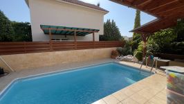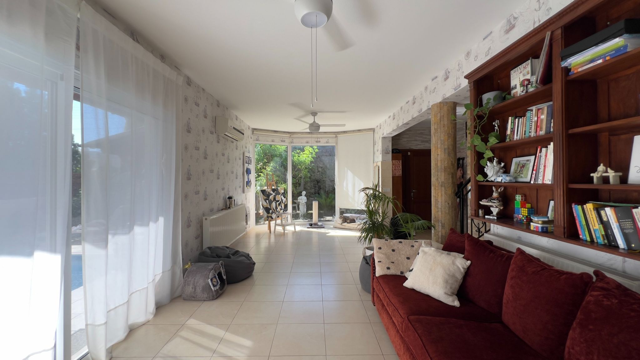 This three-bedroom villa is conveniently located in the heart of the Limassol tourist area in a quiet neighbourhood 600 meters away from the seafront (Dasoudi beach), close to shops, and restaurants. The covered area of the villa is 147 sq.m, the total lot area is 290 sq.m, the covered veranda is 15 sq.m, and the master bedroom is en suite with shower and comprises a large wardrobe. There’s also a bathroom and a guest toilet downstairs, the kitchen is connected with the living room. The villa is fully furnished and equipped with all necessary electrical appliances, diesel central heating, solar panels, double-glazed windows, the internet, an alarm system, a private swimming pool, and a garden.