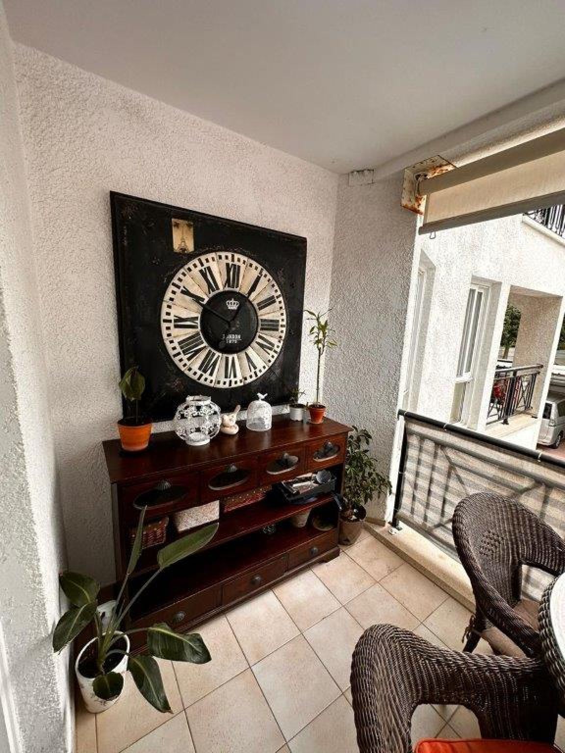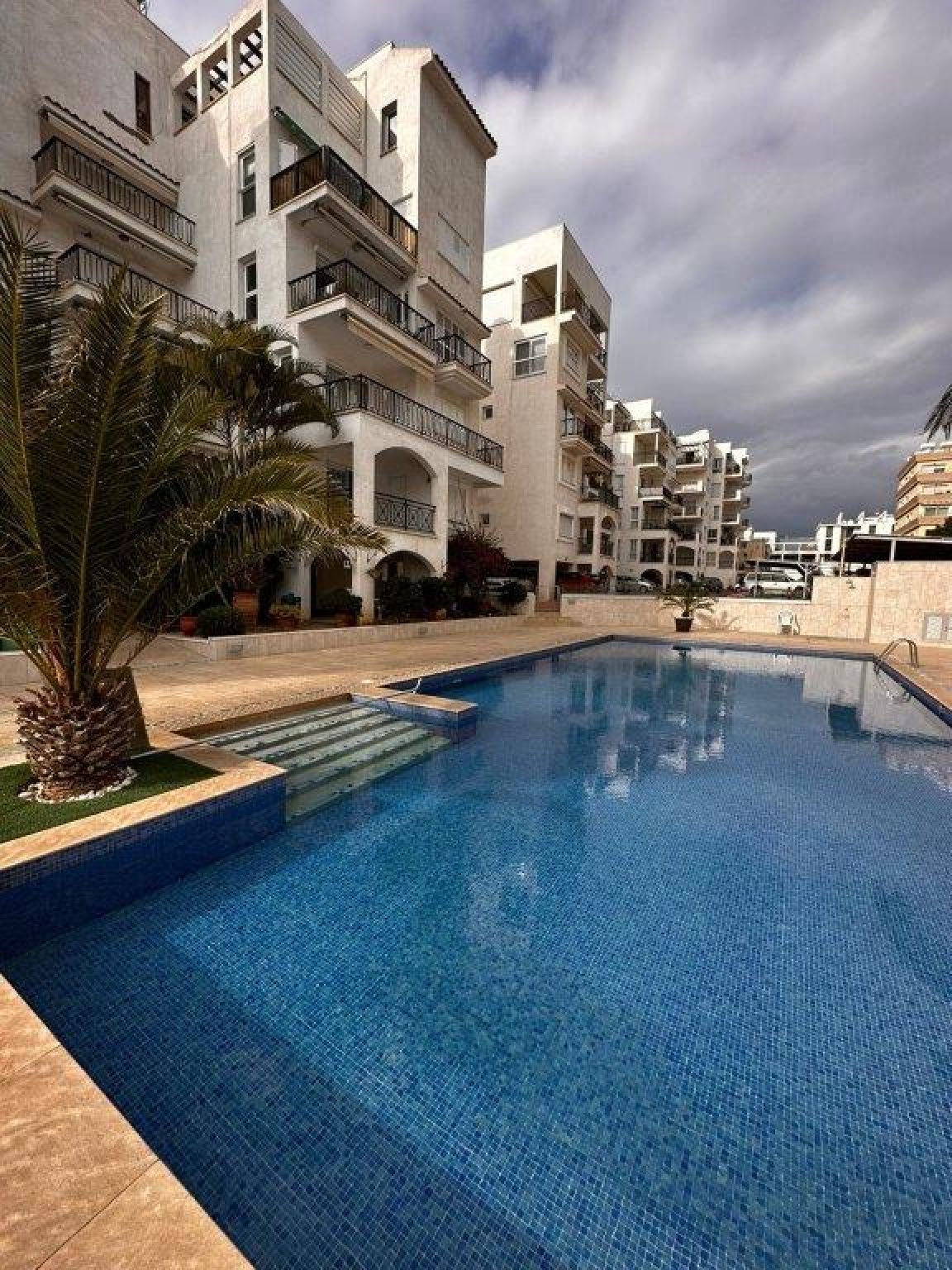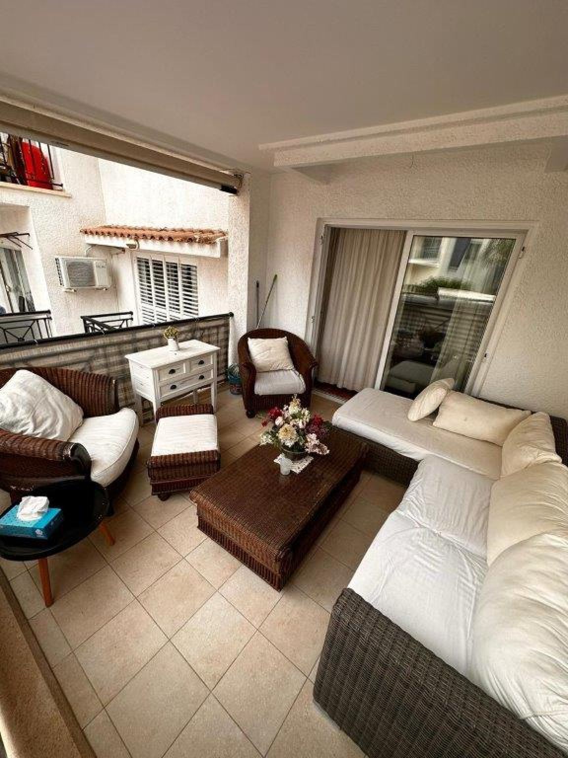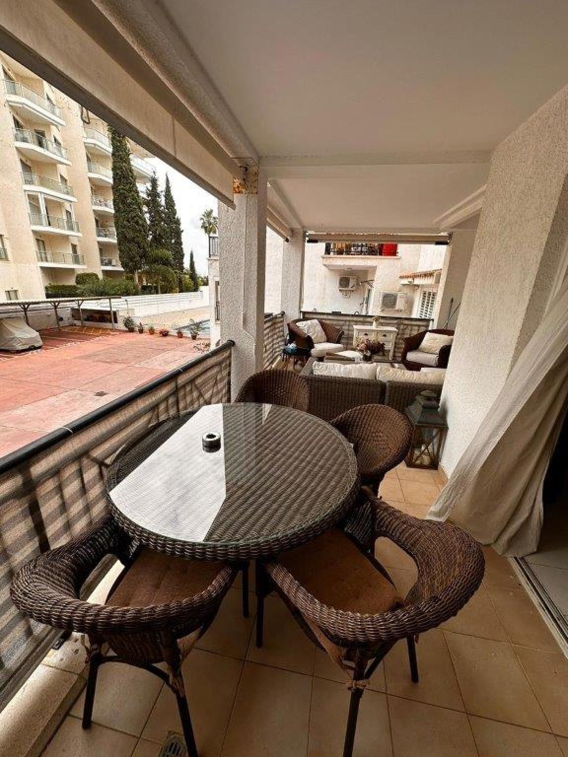 Spacious two-bedroom apartment near the sea in the gated complex with swimming pool. The covered area is 90 sq. m 25 sq. m covered veranda. It consists of the entrance hall, guest WC, kitchen, two bedrooms, family bathroom and big covered veranda. It is fully furnished and equipped. Also there is covered parking .