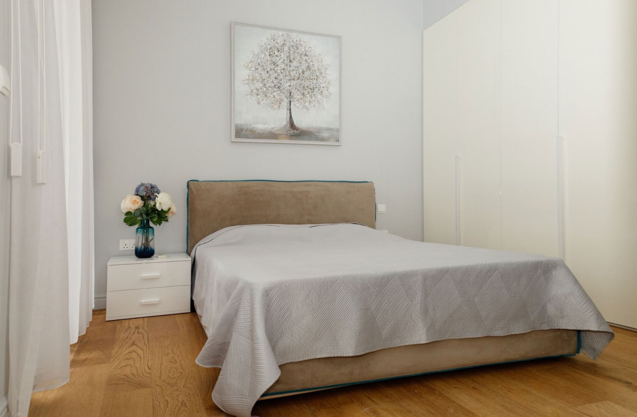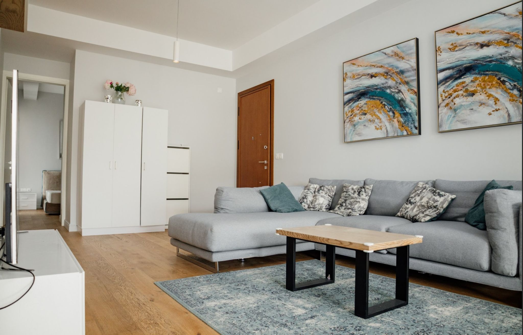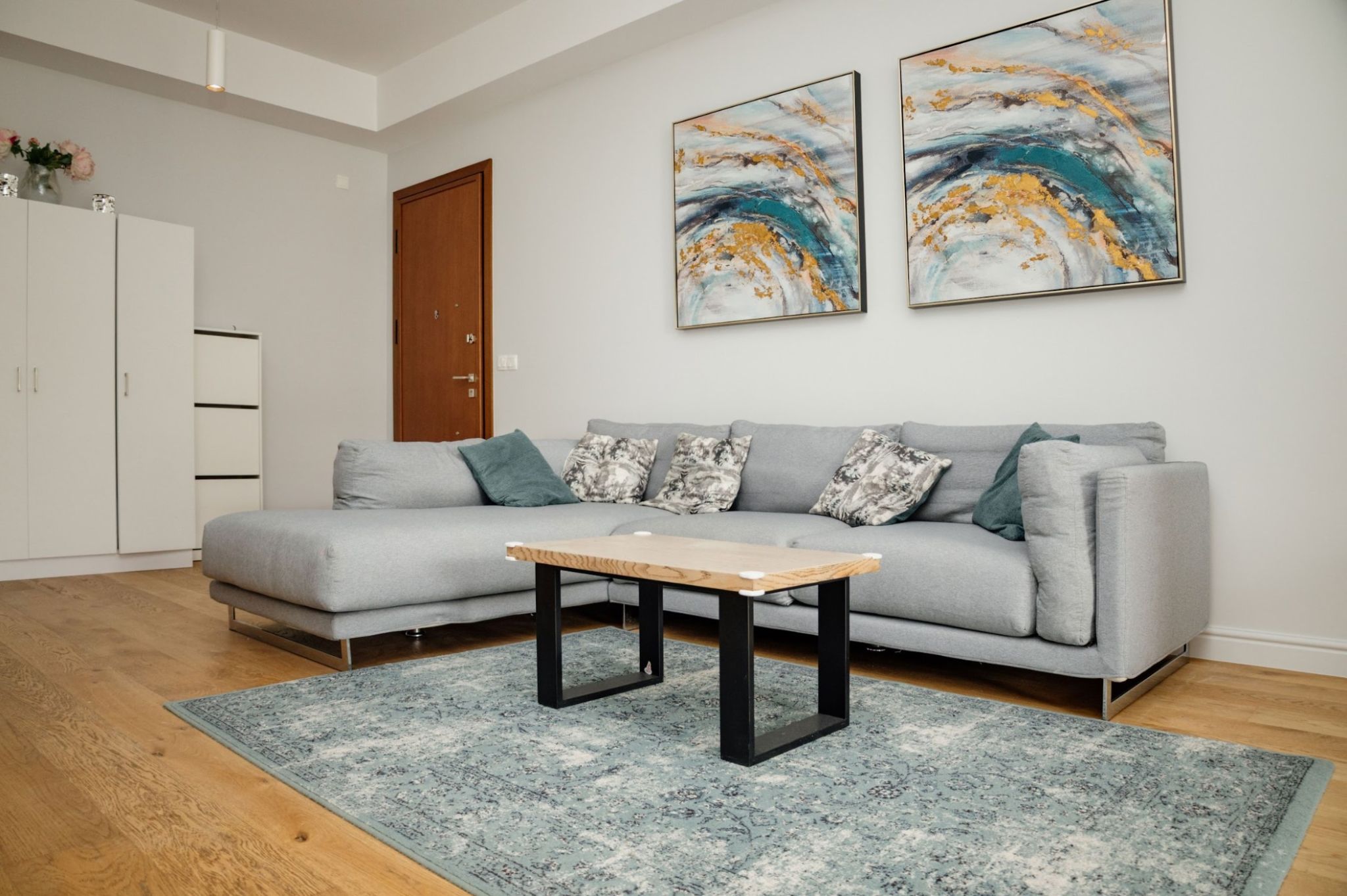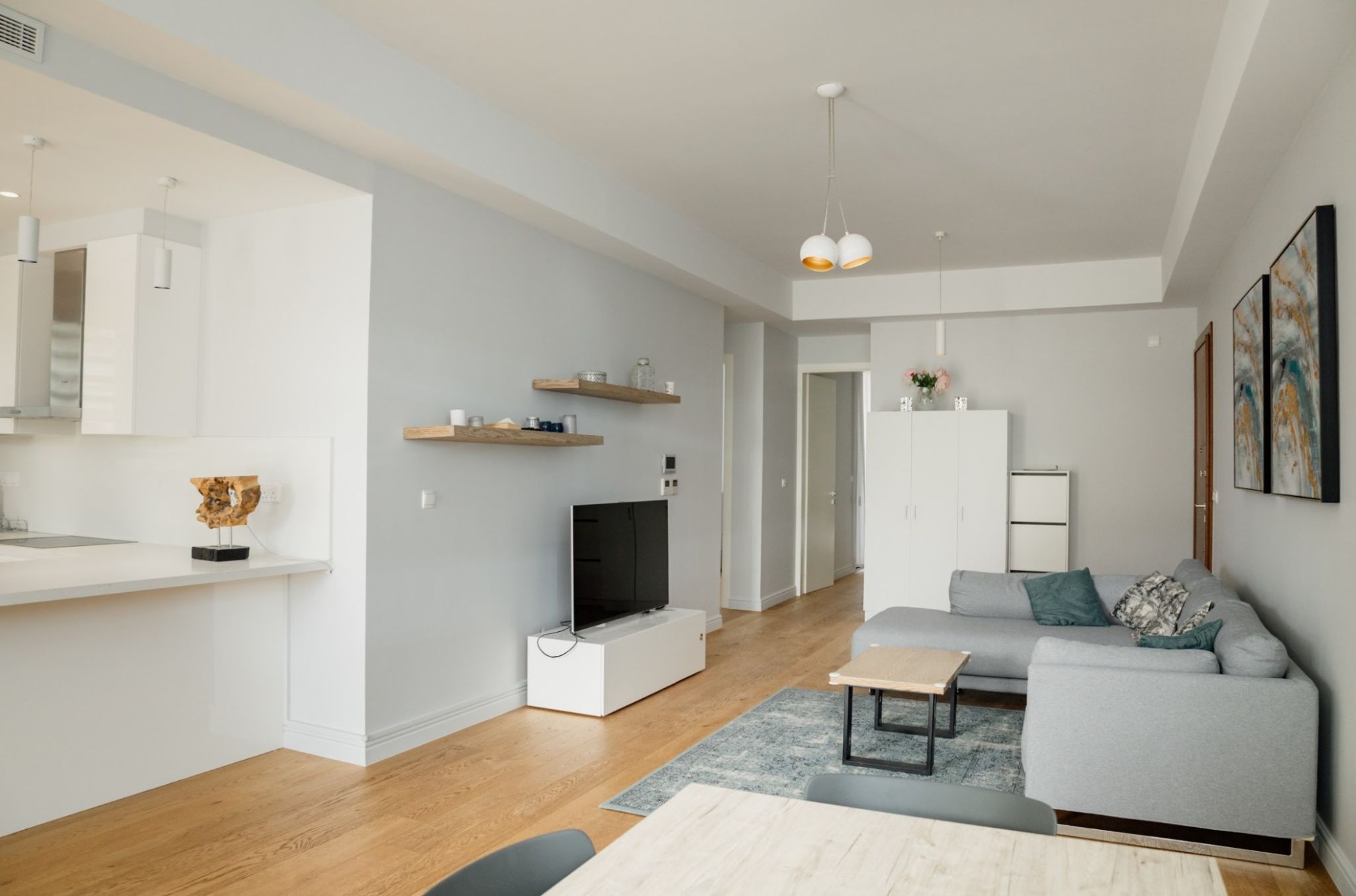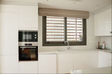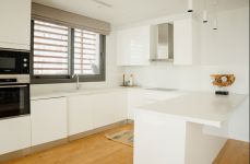 Wooden floors in living area, kitchen and bedrooms