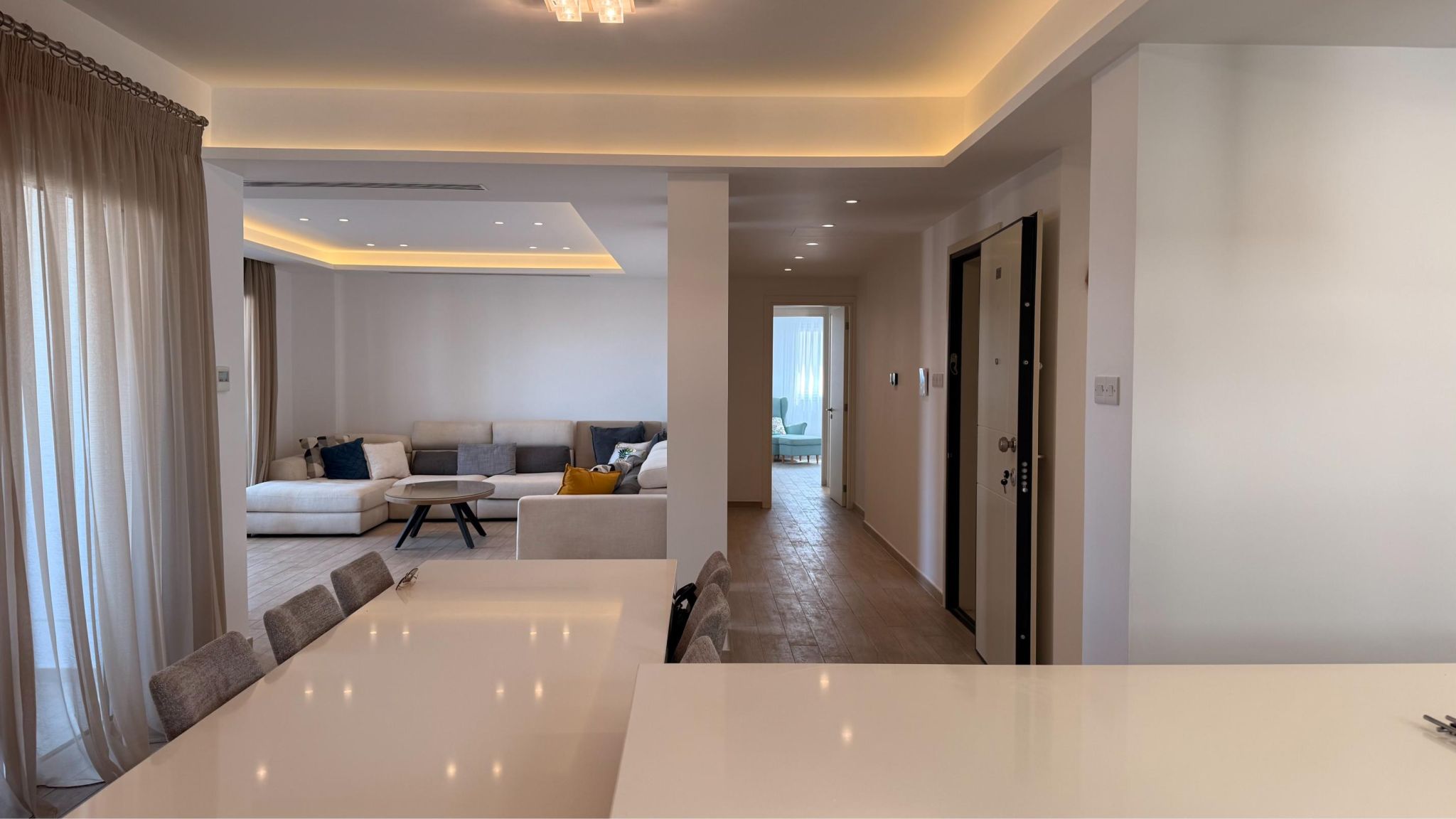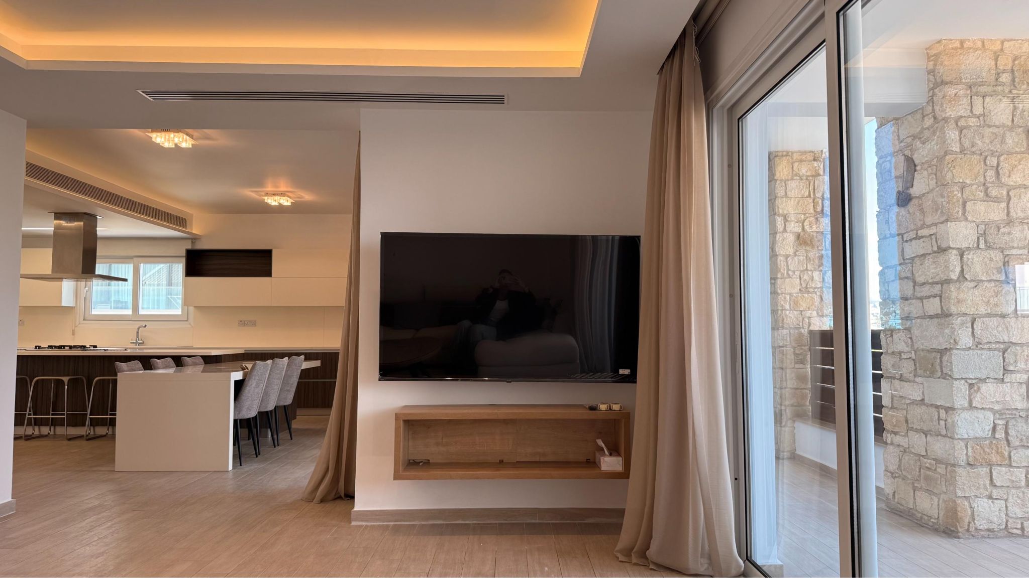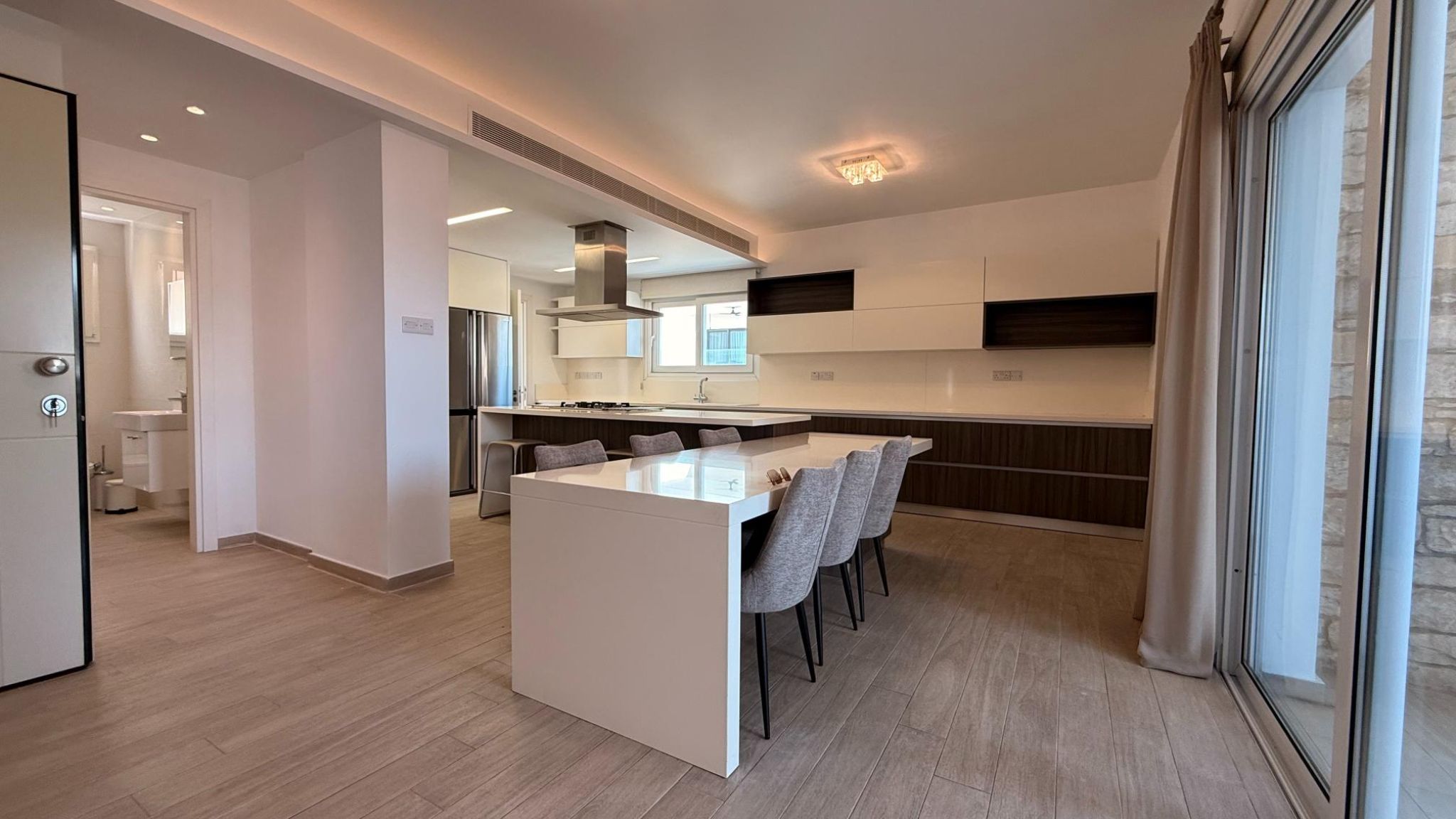 Fully furnished and equipped with a VRV air conditioning system, petrol underfloor heating, solar panels, and electric blinds, the apartment ensures year-round comfort.