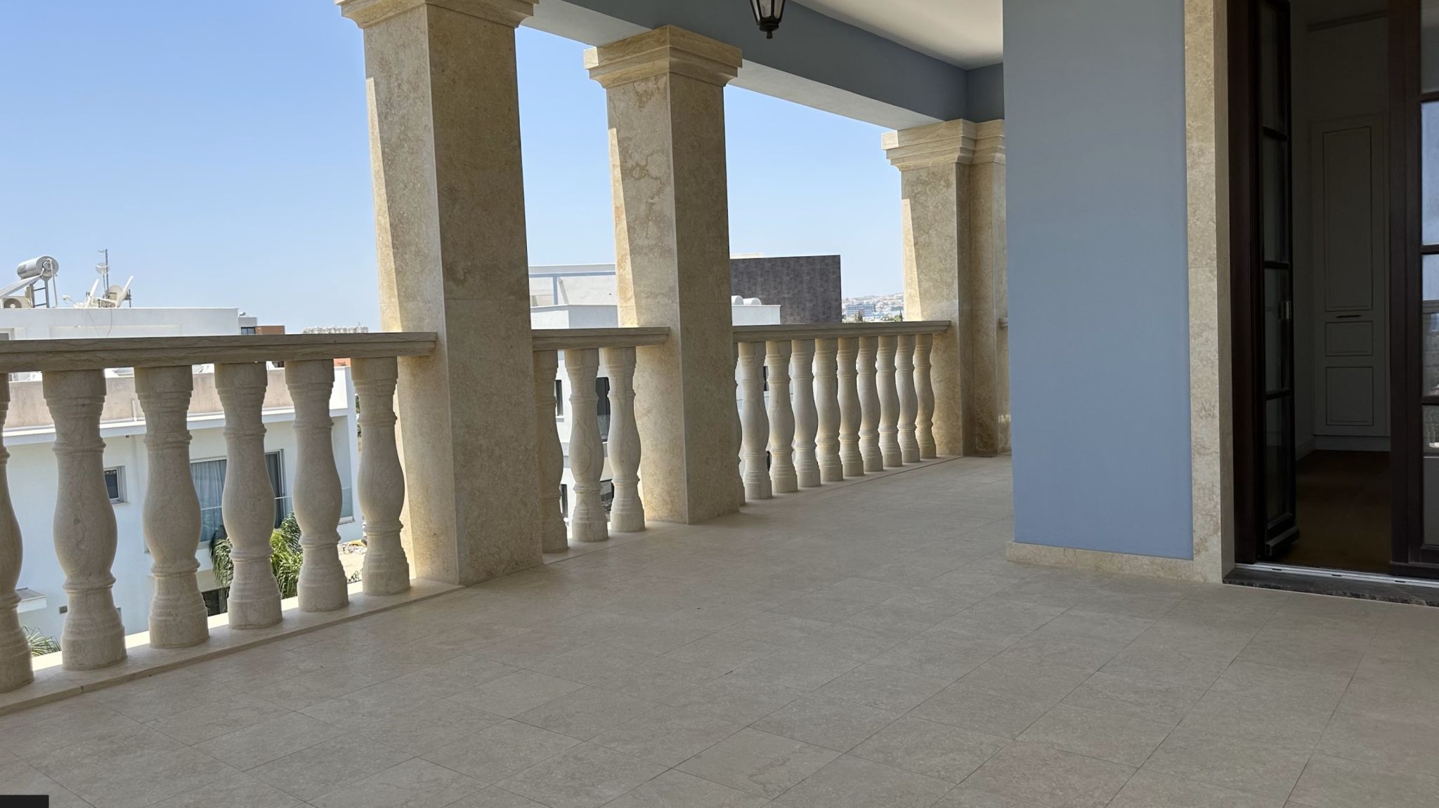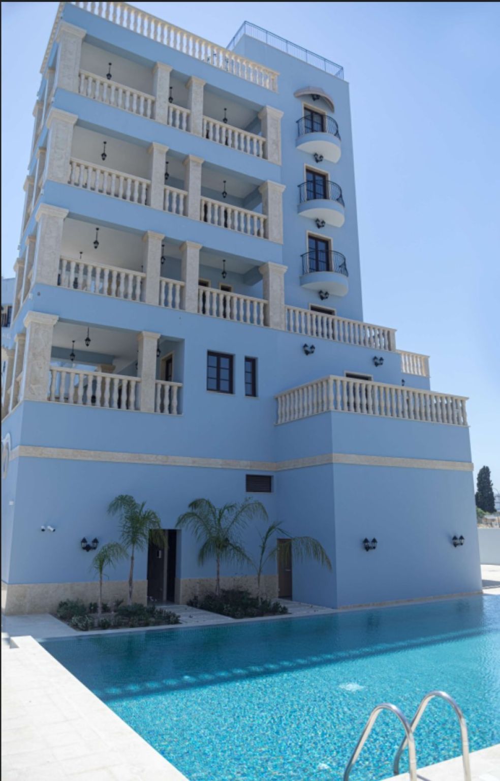 The complex is executed in classical colonial style of Cypriot/European architecture. The facade is elaborately decorated with columns, balustrades, window/door frames, and decorative elements made of natural stone. Open balconies are closed in with handmade railings made of wrought iron and balustrades.